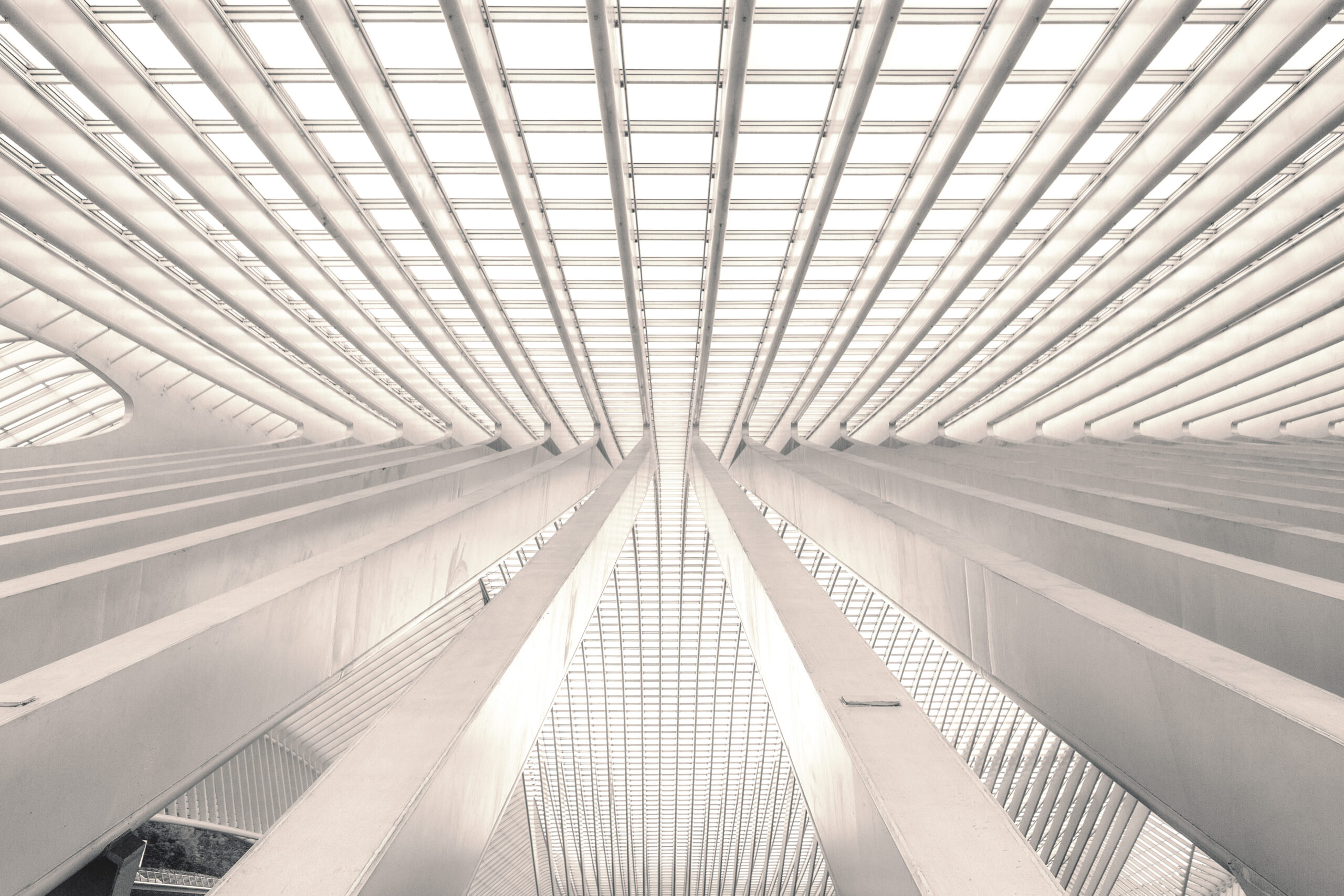 Das Bild zeigt den Innenraum des Bahnhofs Liège-Guillemins in Lüttich, Belgien. Auf den ersten Blick fällt die beeindruckende, geometrische Struktur…