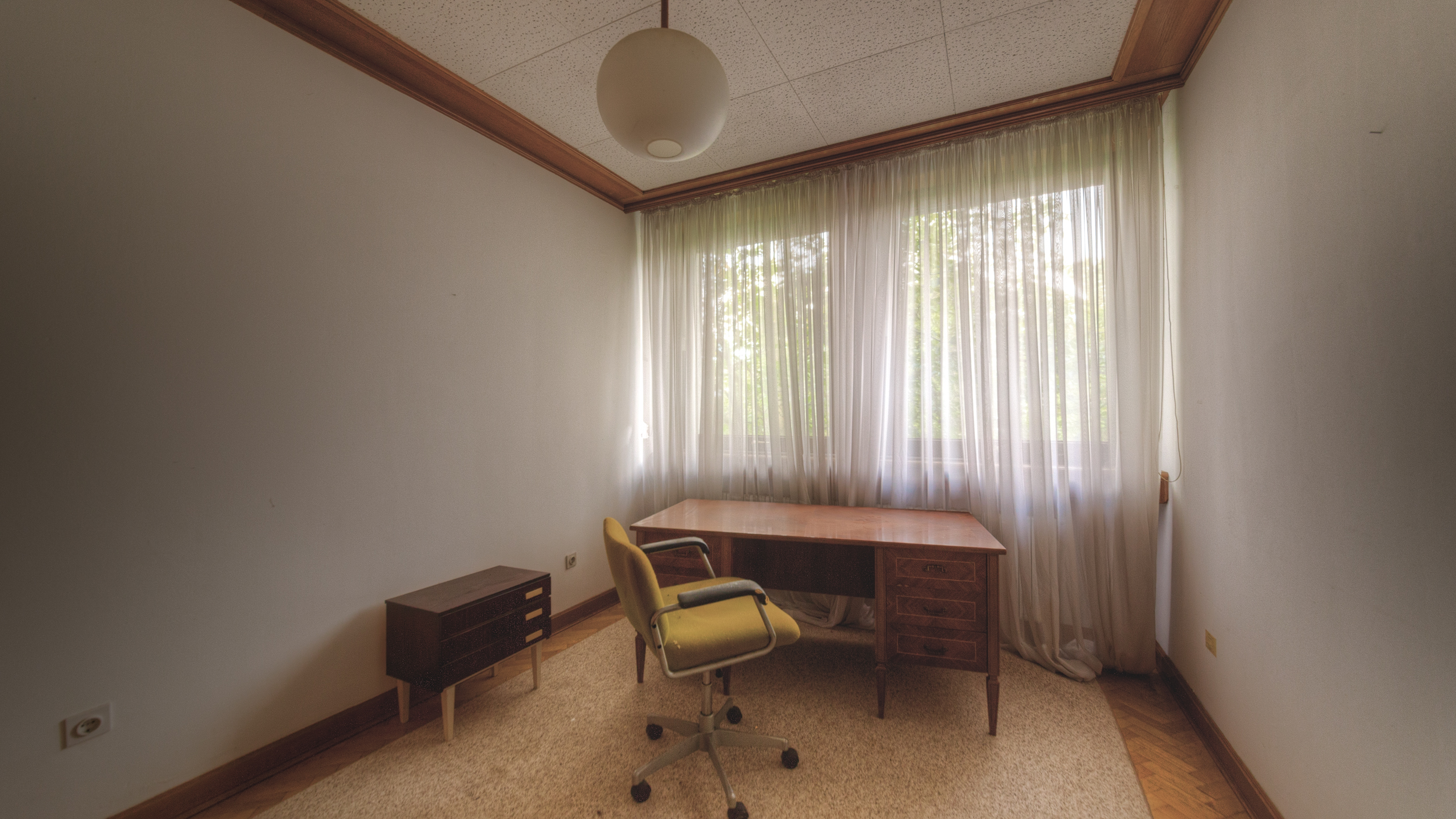Eine alte Kommode mit einer Kerzenhalter und einem Mantel, der über einem Stuhl hängt. Der Raum wirkt verlassen und doch…
