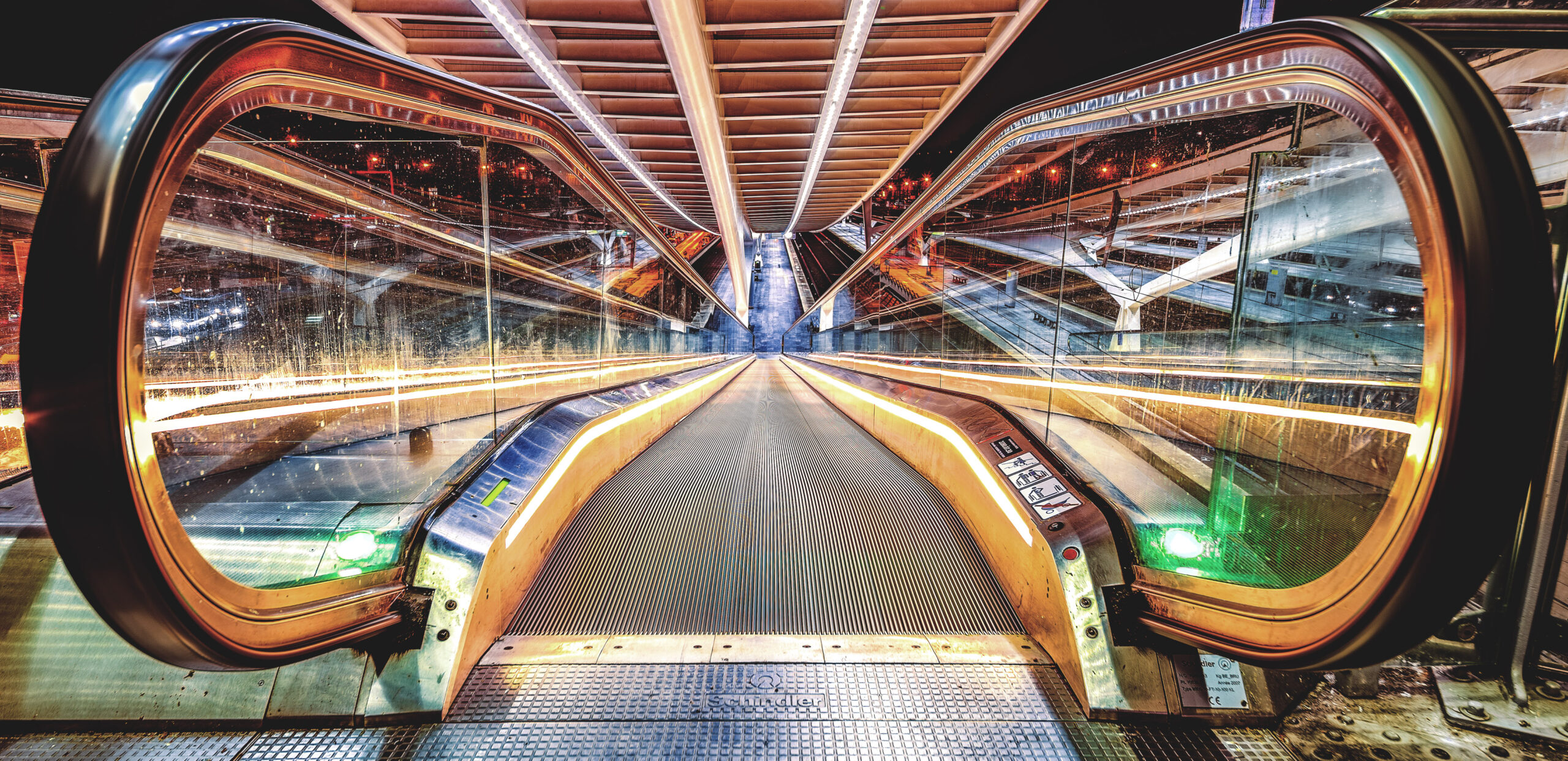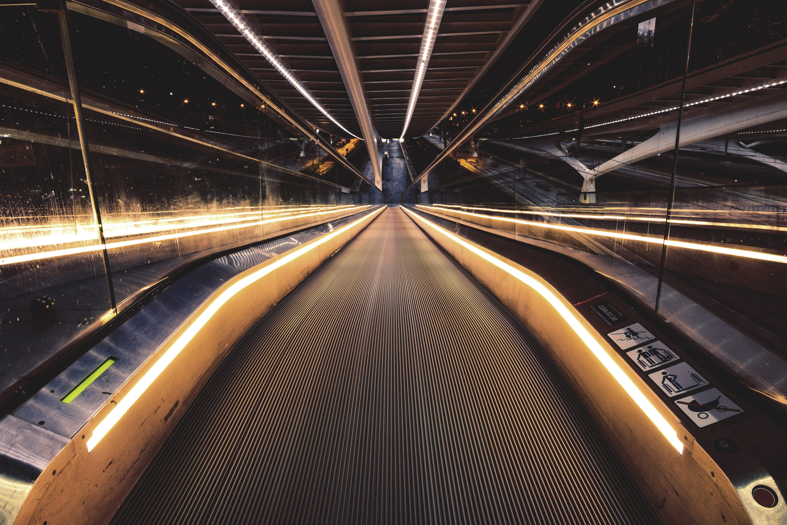 Ich stehe am Fuße einer monumentalen Rolltreppenanlage im Bahnhof Liège-Guillemins, Lüttich-Centre, Belgien. Die Aufnahme entstand an einem späten Winterabend des…